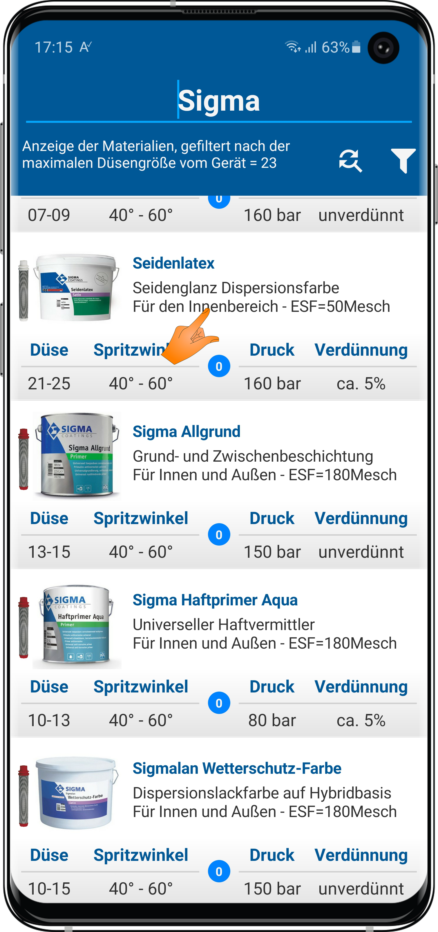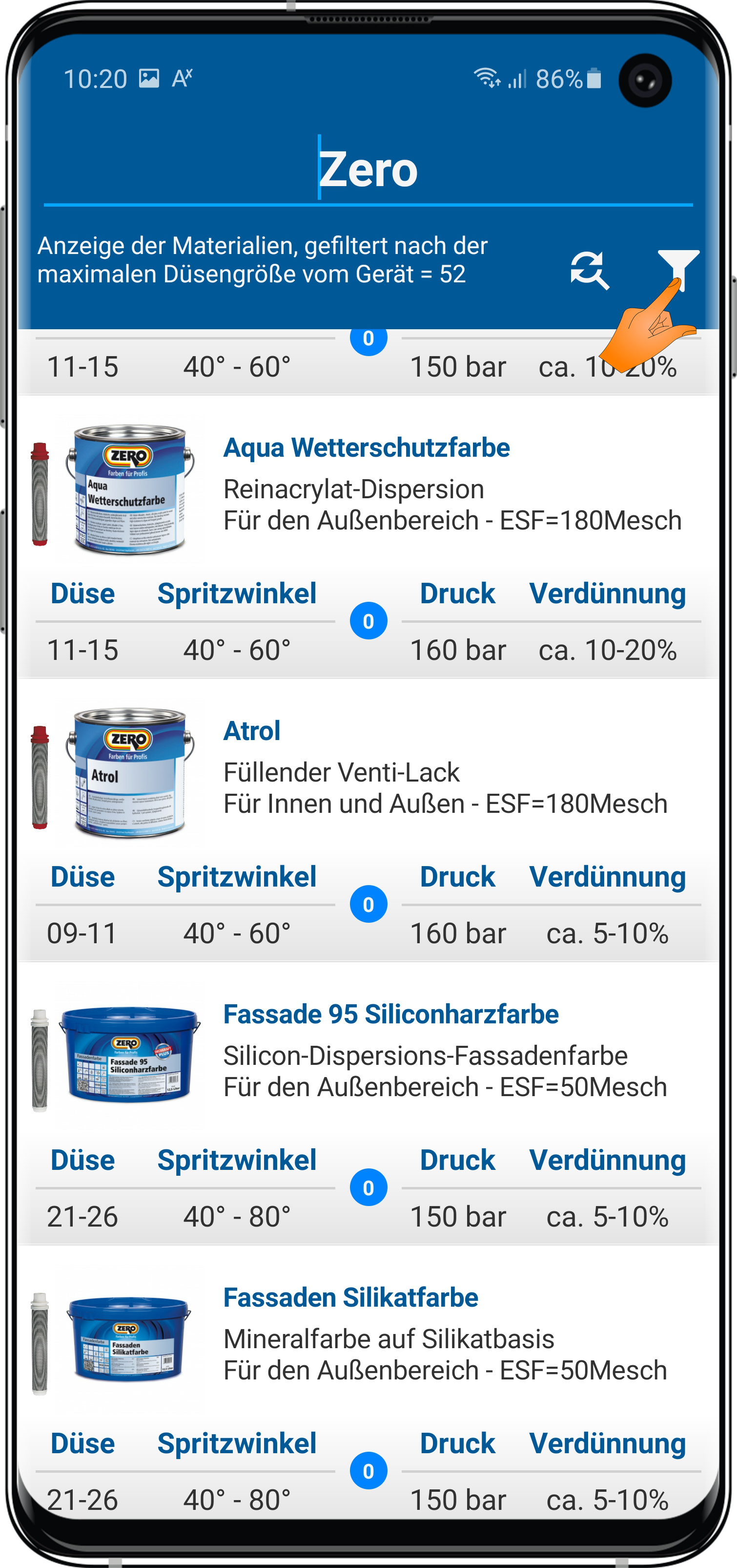 dass wenn Du oben auf das Filter-Icon tippst, Dir nur Produkte deiner max. Düsengröße angezeigt werden?